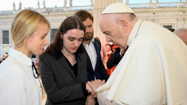 Kateryna y Yulya pudieron saludar al Santo Padre al término de la Audiencia General en la plaza de San Pedro y le detallaron las condiciones de vida de sus maridos en Ucrania