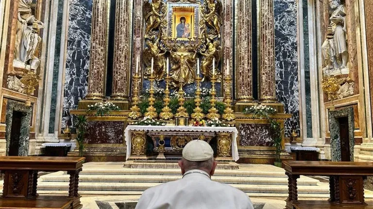 Ante el icono de la Virgen Salus Populi Romani, Francisco quiso rezar unos instantes a solas, en silencio, sentado en una silla de ruedas, pidiendo protección y apoyo
