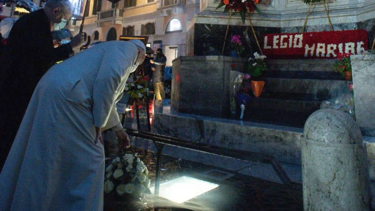 El Papa no ha querido faltar a su cita con la estatua de la Virgen de la Inmaculada en la plaza de España de Roma y ha acudido de incógnito a primera hora de la mañana para rezar ante ella de forma privada durante unos diez minutos.