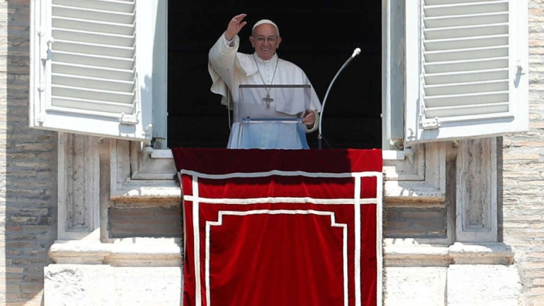 Pope Francis waves during his Sunday Angelus prayer in Saint Peter's square at the Vatican