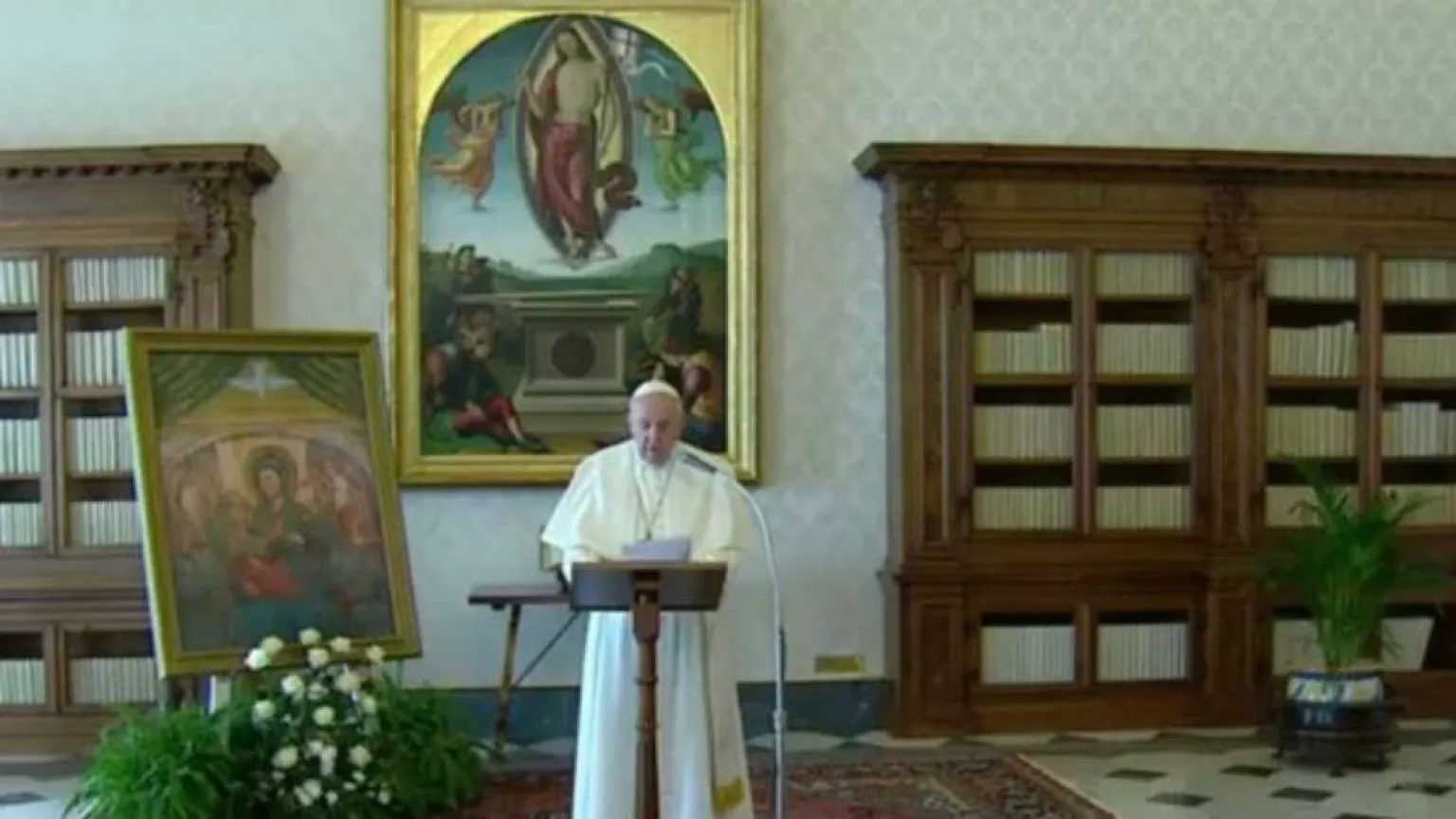 “Es un poco extraño esta oración del Ángelus de hoy con el Papa ‘enjaulado’ en la Biblioteca, pero yo los veo, les soy cercano”, ha asegurado el Pontífice desde la Biblioteca del Palacio Apostólico del Vaticano en transmisión televisiva en vivo.