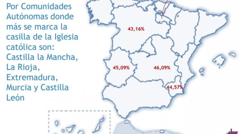 Pero, ¿en qué comunidades autónomas se marca más la 'X' para la Iglesia Católica? Según el dossier publicado este martes, son Castilla la Mancha (46,09%), La Rioja (45,62%), Extremadura (45,09%), Murcia (44,57%) y Castilla León (43,16%). Mientras, las provincias donde más se marca, por encima del 45% son: Albacete, Ávila, Badajoz, Burgos, Ciudad Real, Cuenca, Palencia, La Rioja y Jaén.