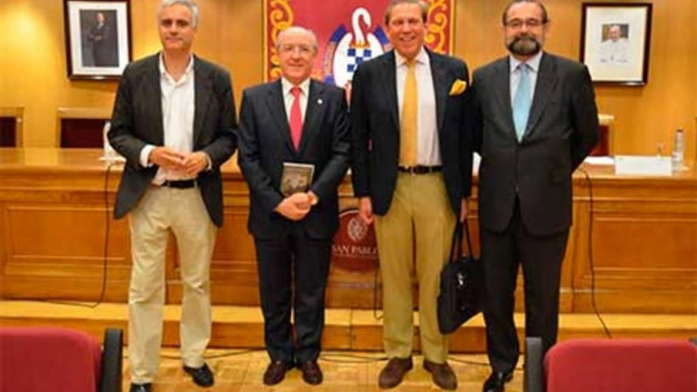 Pie de foto de izquierda a derecha: El periodista Fernando de Haro; el presidente de la Fundación Universitaria San Pablo CEU, Carlos Romero; el vicepresidente ejecutivo de la Fundación Ignacio Larramendi, Luis H. de Larramendi; y el director del Instituto CEU de Estudios Históricos, Alfonso Bullón.