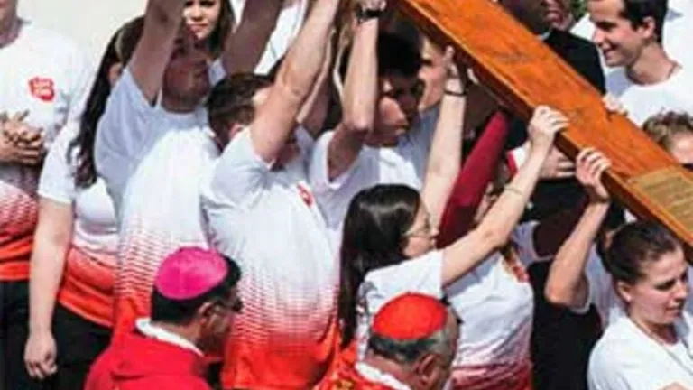 Jóvenes polacos toman la Cruz de las JMJ. Es imagen tomada, en Roma, el Domingo de Ramos del año pasado. Polonia, concretamente la ciudad de Cracovia ?en el corazón de la tierra del Papa San Juan Pablo II, el creador de las JMJ- se prepara para una nueva edición de este evento. Será del 25 de julio al 1 de agosto de 2016.