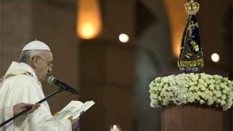 Al concluir la Misa en el Santuario de Aparecida los acólitos hicieron ademán de entregar al Papa el báculo pastoral para descender del altar. Con un rápido movimiento Francisco declinó la invitación y pidió con viveza que en su lugar le diesen la pequeña imagen réplica de Nuestra Señora de Aparecida, que el Arzobispo de la diócesis, Cardenal Raymundo Damasceno, le había obsequiado al inicio de la celebración. Se diría que el Papa no la sostenía sino que se agarraba a la frágil figura de la Virgen.
