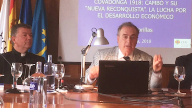 Su ponencia "Covadonga 1918: Cambó y su 'nueva reconquista? la lucha por el desarrollo económico". Aludió al encuentro que Cambó mantuvo con Ángel Herrera, en Merylan (EE. UU). Antes tuvo lugar la crisis de 1929, la más grande. En 1931 tiene lugar la mayor caída de la bolsa en España. En el diálogo, el profesor Javier Morillas propuso que nos quedásemos con lo mejor de Cambó. Expuso el contexto económico y político en el que, hace un siglo, se produjo la coronación canónica de la Virgen de Covadonga (la Santina) y la creación del Parque Nacional de la Montaña de Covadonga. Destacó el protagonismo de Francesc Cambó Batle (político catalán y abogado de ideología conservadora. Cofundador y líder de la Liga Regionalista. Fue ministro de Fomento y posteriormente de Hacienda y de Fomento durante el reinado de Alfonso XIII).