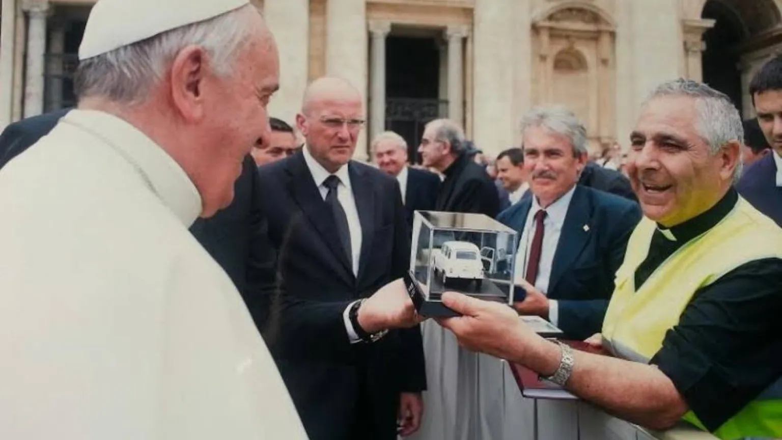 Como ofrenda de cariño la Delegación española ? con más de 50 años de historia – con D. Jose Aumente al frente, Director del Departamento de pastoral de la carretera, le ofreció ( entre otros regalos incluido un chaleco reflectante con el escudo vaticano) un detalle cercano que el Santo Padre reconoció enseguida : Una miniatura del coche utilitario Renault-4, el comúnmente llamado "Cuatro latas" que el Papa utilizaba en sus desplazamientos por Buenos Aires. Esta vez pintado de blanco y con la matrícula de la Ciudad del vaticano.