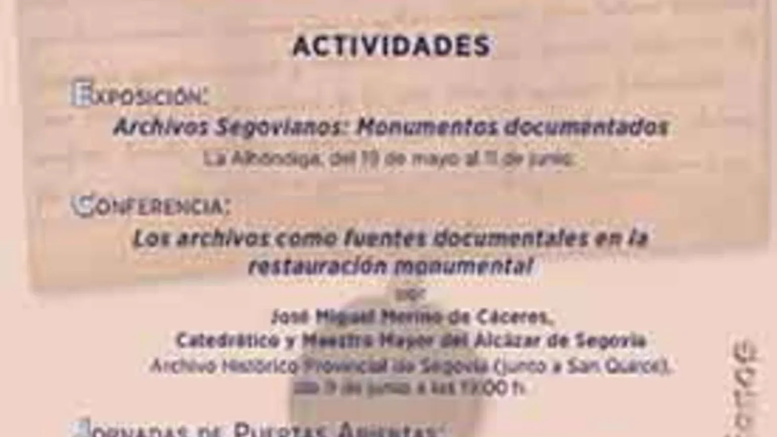 Como acto principal, y coincidiendo con el 9 de junio, fiesta de los archivos, a las 19h el patio del Archivo Histórico Provincial de Segovia será el centro de la Conferencia-coloquio bajo el título "Los archivos como fuentes documentales en la restauración monumental". El encargado de realizar la conferencia es D. José Miguel Merino de Cáceres coordinado por Dª María Pía Senet.