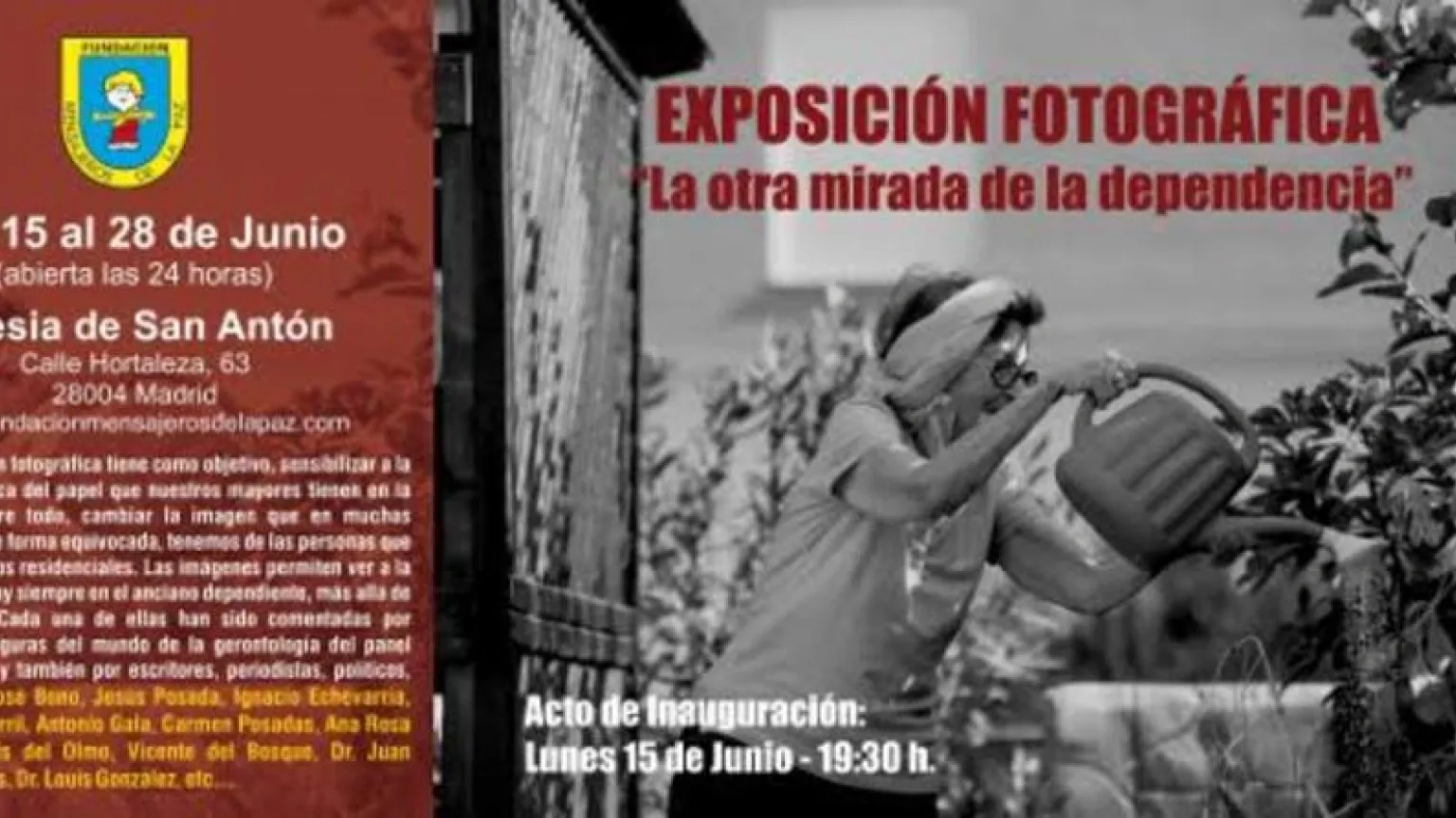 Mensajeros de la Paz abre la programación cultural de la Iglesia de San Antón con la muestra fotográfica "La otra mirada de la dependencia", compuesta por 29 instantáneas realizadas por el fotógrafo murciano Antonio Molina, que se acompañan de otros tantos textos, que a modo de reflexiones sobre la ancianidad, han sido escritos por relevantes personalidades españolas y extranjeras del mundo de la cultura, la política, la comunicación, las artes, o la geriatría como Antonio Gala, Carmen Posadas, Luis del Olmo, Ana Rosa Quintana, José Bono, Soledad Becerril, Vicente del Bosque, o la Dra. Graciela Zarebski, entre otros. Todos ellos han brindado su colaboración desinteresada a esta iniciativa, cuyo objetivo es reivindicar la presencia y reconocimiento social de los mayores, muy especialmente de los que viven en residencias; y denunciando estereotipos sobre el mayor dependiente, recordar a toda la sociedad que en las residencias hay vida, hay personas que sienten, se ríen, se alegran y se entristecen.