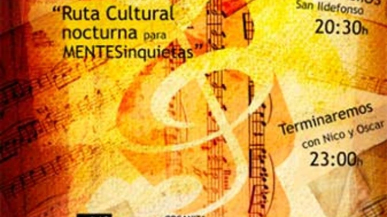Se trata de una noche cultural por diferentes espacios para participar en cada uno de ellos de una actividad diferente: música, poesía, teatro… Este evento está en la línea de la iniciativa "Atrio e los gentiles" que Benedicto XVI ha promocionado como espacio para el diálogo FE ? CULTURA en el marco de la Nueva Evangelización. Comienza en San Ildefonso a las 20.30 con el Coro de la Universidad y termina en el Salón Mudéjar a las 23.30 con Nico y Óscar, componentes de "Hombre Garabato". Tres horas de búsqueda en buena compañía.