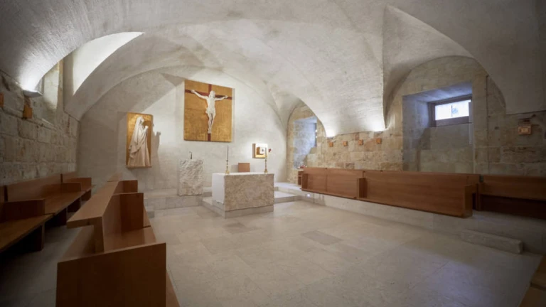 El proyecto partió de la decisión de realizar una intervención discreta, con tintes actuales que respetara el estilo singular del edificio donde se ubica. Las paredes de piedra de Villamayor contrastan con la piedra caliza, de Campaspero, con la que se creó un muro que articula todo el conjunto -acceso, sacristía y capilla- que reparte los espacios y recoge en su interior las necesidades de cada uno. Con esta piedra se creó también un zócalo perimetral corrido que organiza el espacio de la capilla, a modo de anillo abierto, donde la comunidad universitaria se coloca en forma de herradura, dirigida hacia el centro donde está ubicado el altar elevado. El espacio cuenta con elementos de madera maciza.