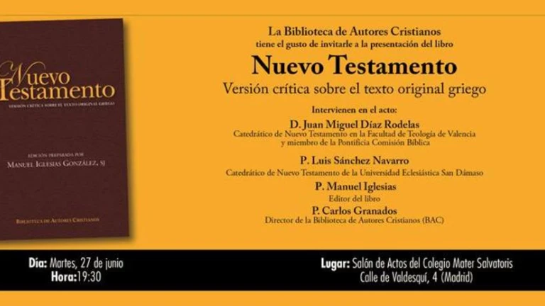 La BAC acaba de publicar una edición del Nuevo Testamento del Profesor Iglesias y estamos organizando un acto de presentación el martes 27 de junio a las 19:30h. en el salón de actos del Colegio Mater Salvatoris.