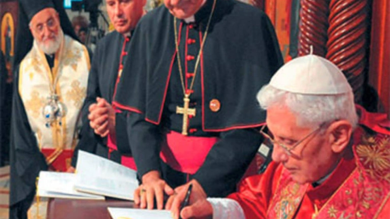 ECCLESIA, en fidelidad a su traducción e identidad, publica el último gran documento pontificio: la exhortación apostólica postsinodal "Ecclesia in Medio Oriente", firmada por Benedicto XVI en Líbano hace un mes. La portada muestra precisamente el momento en que el Papa, en la basílica de San Pablo de Harissa, estampa su firma sobre un documento que, jamás, bajo ningún concepto, puede pasar inadvertido. El texto es una propuesta, una profecía de paz para la atribulada y querida región de Oriente Medio, donde nació el cristianismo y es, de algún modo, símbolo y emblema de la entera humanidad en su pluralidad, grandeza, fragilidad y expectativas. Porque Oriente Medio nos ha de interesar y concernir, pues, a todos.