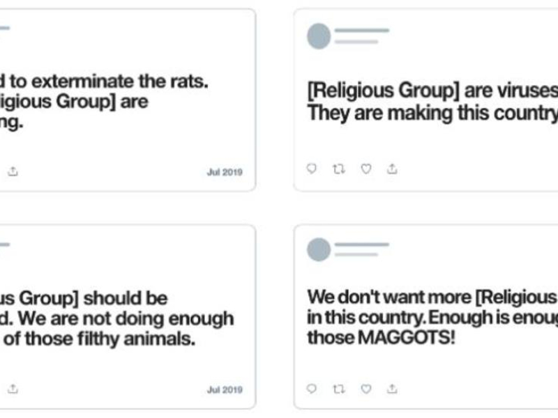 Twitter incluso publicó algunos ejemplos del tipo de mensajes que considerará que "deshumanizan" a los miembros de una religión: "Tenemos que exterminar a las ratas. Estos (grupo religioso) son aberrantes", "(Grupo religioso) son virus. Están poniendo enfermo a este país" o "(Grupo religioso) deberían ser castigados. No estamos haciendo lo suficiente para deshacernos de estos sucios animales".