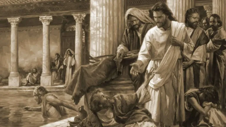 Se celebraba una fiesta de los judíos, y Jesús subió a Jerusalén. Hay en Jerusalén, junto a la Puerta de las Ovejas, una piscina que llaman en hebreo Betesda. Esta tiene cinco soportales, y allí estaban echados muchos enfermos, ciegos, cojos, paralíticos. Estaba también allí un hombre que llevaba treinta y ocho años enfermo.