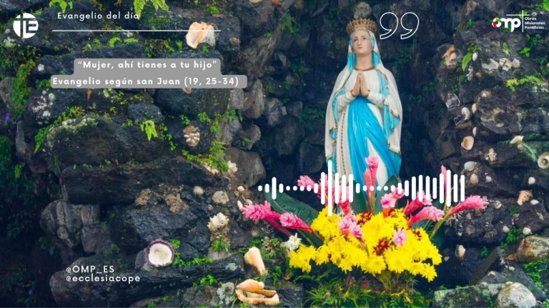 Junto a la cruz de Jesús estaban su madre, la hermana de su madre, María, la de Cleofás, y María, la Magdalena. Jesús, al ver a su madre y junto a ella al discípulo al que amaba, dijo a su madre: «Mujer, ahí tienes a tu hijo».