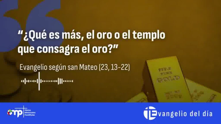 En aquel tiempo, habló Jesús diciendo: «¡Ay de vosotros, escribas y fariseos hipócritas, que cerráis a los hombres el reino de los cielos! Ni entráis vosotros, ni dejáis entrar a los que quieren. ¡Ay de vosotros, escribas y fariseos hipócritas, que viajáis por tierra y mar para ganar un prosélito y, cuando lo conseguís, lo hacéis digno del fuego el doble que vosotros! ¡Ay de vosotros, guías ciegos, que decís: «Jurar por el templo no obliga, jurar por el oro del templo sí obliga»? ¡Necios y ciegos! ¿Qué es más, el oro o el templo que consagra el oro? O también: «Jurar por el altar no obliga, jurar por la ofrenda que está en el altar sí obliga.» ¡Ciegos! ¿Qué es más, la ofrenda o el altar que consagra la ofrenda? Quien jura por el altar jura también por todo lo que está sobre él; quien jura por el templo jura también por el que habita en él; y quien jura por el cielo jura por el trono de Dios y también por el que está sentado en él.»