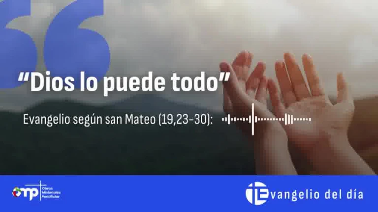 Evangelio “Dios lo puede todo”Evangelio según san Mateo (19,23-30) y comentario de José María Calderón, director nacional de OMP00:00 Volumen CerrarRedacción digitalMadrid - Publicado el 19 ago 2024, 16:521 min lecturaFacebookTwitterWhatsappTelegramEnviar por emailCopiar enlacenuestros programasLa Linterna de la IglesiaCon Irene PozoViernes de 22:30h a 23:30hIglesia NoticiaCon Faustino CatalinaDomingos de 8:30h a 9:00hSanta MisaTodos los domingosDe 9:00h a 9:45hEcclesia al díaCon Raquel CaldasLunes a viernes a las 12.05hEcclesiaCon Álvaro SáezDomingos a las 13:00hMisioneros por el mundoCon Asell Sánchez-VicenteViernes a las 21:30h Lo último Beato Marcelo Spínola 19 ene 2026, 00:00 0:49 min Separación de bienes o gananciales: La respuesta definitiva de María Álvarez de las Asturias y Mercedes Honrubia tras 25 años asesorando matrimonios 18 ene 2026, 16:00 5 min Mario León, misionero español en el Sahara que gestiona un centro de niños con discapacidad: "Son rechazados socialmente o considerados una carga" 18 ene 2026, 16:00 8:07 min El Vaticano medió para que Maduro se exiliase a Rusia antes de que Estados Unidos le detuviera en el ataque a Caracas del 3 de enero 18 ene 2026, 15:14 3 min El Papa en el Ángelus: "Huir de un estilo de vida superficial" 18 ene 2026, 12:47 2 min El Secretario de Estado de la Santa Sede, Parolin alerta sobre el nuevo orden mundial: "se está extendiendo un desprecio por la paz y la justicia" 18 ene 2026, 11:28 4 min Visto en ABC Senegal se enfrenta a Marruecos en la final de la Copa África: horario y dónde ver