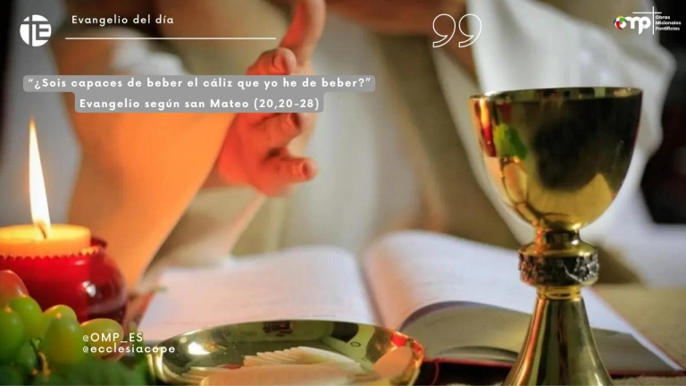 Evangelio "¿Sois capaces de beber el cáliz que yo he de beber?"00:00 Volumen CerrarRedacción digitalMadrid - Publicado el 24 jul 2024, 11:371 min lecturaFacebookTwitterWhatsappTelegramEnviar por emailCopiar enlacenuestros programasLa Linterna de la IglesiaCon Irene PozoViernes de 22:30h a 23:30hIglesia NoticiaCon Faustino CatalinaDomingos de 8:30h a 9:00hSanta MisaTodos los domingosDe 9:00h a 9:45hEcclesia al díaCon Raquel CaldasLunes a viernes a las 12.05hEcclesiaCon Álvaro SáezDomingos a las 13:00hMisioneros por el mundoCon Asell Sánchez-VicenteViernes a las 21:30h Lo último Beato Marcelo Spínola 19 ene 2026, 00:00 0:49 min Separación de bienes o gananciales: La respuesta definitiva de María Álvarez de las Asturias y Mercedes Honrubia tras 25 años asesorando matrimonios 18 ene 2026, 16:00 5 min Mario León, misionero español en el Sahara que gestiona un centro de niños con discapacidad: "Son rechazados socialmente o considerados una carga" 18 ene 2026, 16:00 8:07 min El Vaticano medió para que Maduro se exiliase a Rusia antes de que Estados Unidos le detuviera en el ataque a Caracas del 3 de enero 18 ene 2026, 15:14 3 min El Papa en el Ángelus: "Huir de un estilo de vida superficial" 18 ene 2026, 12:47 2 min El Secretario de Estado de la Santa Sede, Parolin alerta sobre el nuevo orden mundial: "se está extendiendo un desprecio por la paz y la justicia" 18 ene 2026, 11:28 4 min Visto en ABC Senegal se enfrenta a Marruecos en la final de la Copa África: horario y dónde ver