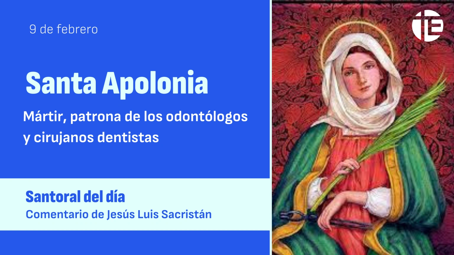 Seguimos recorriendo el Calendario Santoral hoy con una joven mártir. Porque hoy recordamos a Santa Apolonia, cuya vida transcurre en Alejandría. Bautizada y educada en la Fe por sus padres, ha hecho firme propósito de renunciar a casarse para consagrarse de lleno al Señor. Todos la conocen por su bondad y sencillez.