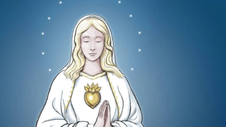 Iconografía: Se le representa con el manto color azul y las manos en oración.