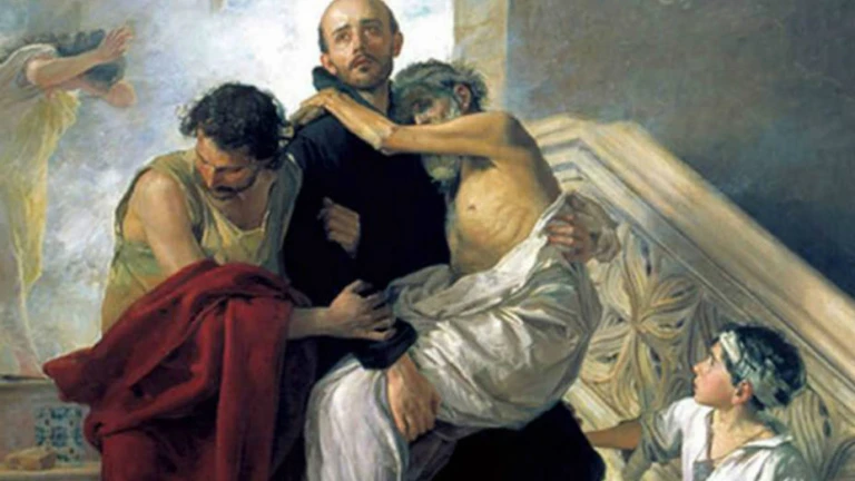 Iconografía: Se le representa con un enfermo en brazos.