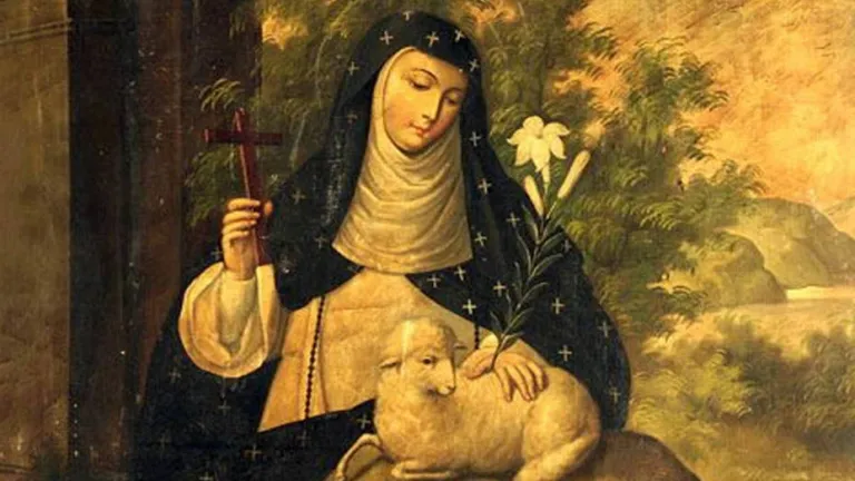 Iconografía: Se le representa con el hábito de dominica y un Cordero, signo de Cristo, el Esposo.