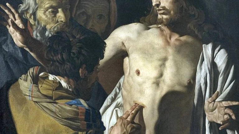 Sin embargo el momento más destacado y conocido es después de la Resurrección. El primer día de la semana, el Señor se aparece a los Apóstoles mostrándoles las manos y el costado, lo que les hace llenarse de alegría y creer en las palabras anteriores a su muerte acerca de que sería crucificado, resucitando al tercer día. Como en ese momento Tomás no está allí, no da crédito a las palabras que le dicen los otros, por lo que desafía a Dios asegurando que sólo creerá si mete la mano en el agujero de los clavos y en su costado.