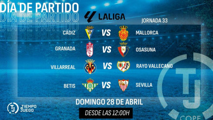 Paco González y Manolo La te esperan este domingo para vivir toda la emoción de los partidos de la 33ª jornada: Cádiz-Mallorca, Granada-Osasuna, Villarreal-Rayo y Betis-Sevilla.