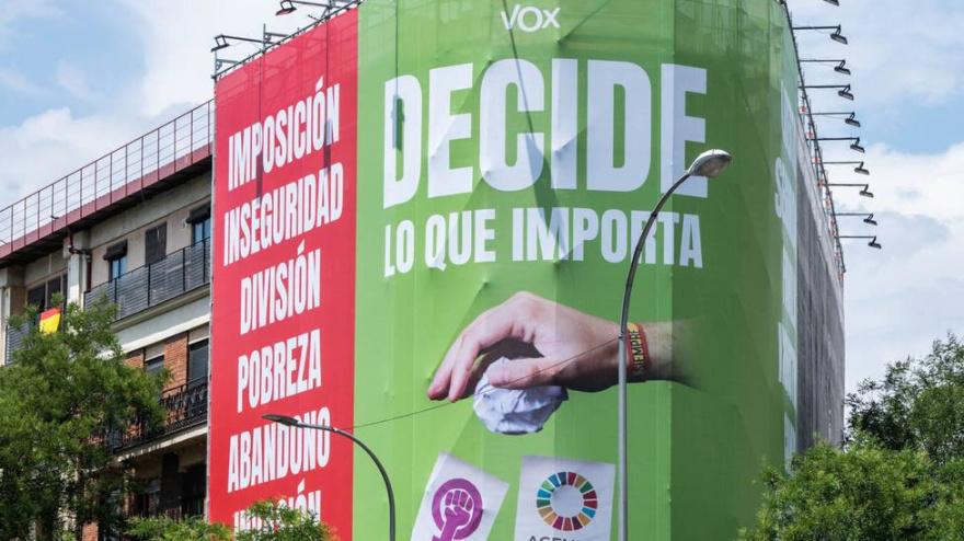 Vox quita la lona de la calle Alcalá tras la orden de la Junta Electoral de Madrid