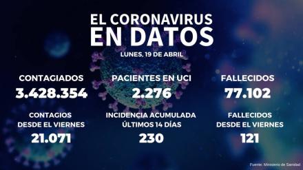 Sanidad ha notificado, además, 121 fallecidos y la incidencia se sitúa en los 230 casos por 100.000 habitantes
