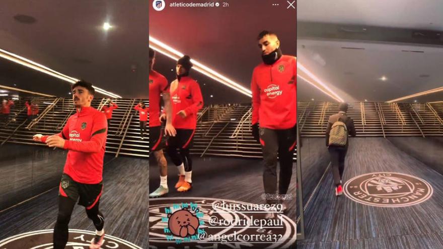 El uruguayo, en una imagen ejemplificante, instó a Correa y De Paul a no pisar el escudo del Manchester City en claro contraste con lo que hizo un criticado Antoine Griezmann.