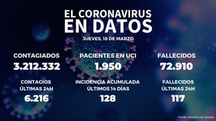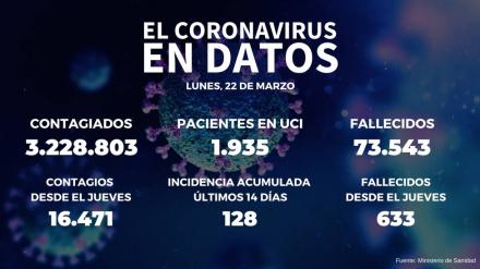 El Ministerio de Sanidad ha notificado 16.471 nuevos contagios desde el pasado jueves y 633 muertes más, con lo que la incidencia acumulada por cada 100.000 habitantes en 14 días se ha elevado seis décimas, hasta 128,7 casos, aunque habrá que esperar aún hasta finales de semana para conocer el efecto del Puente de San José en la evolución de la pandemia. ,Sanidad también ha reportado un incremento de la incidencia acumulada en 7 días, que pasa de 61,4 el pasado jueves a 62