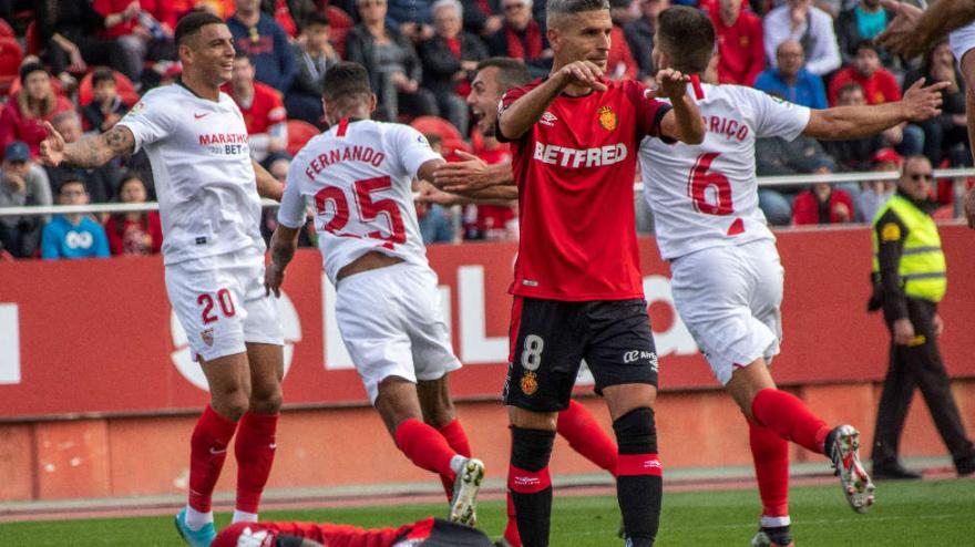 El Sevilla ganó 0-2 en Mallorca con goles de Diego Carlos y Banega (p.) y sigue tercero. El VAR anuló un gol dudoso al Mallorca y señaló el penalti.