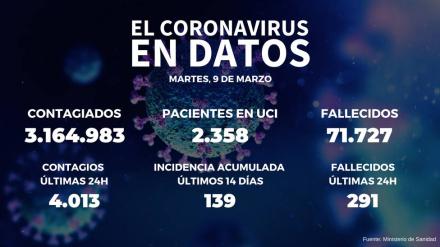 Sanidad notifica 4.013 nuevos positivos y 291 fallecidos en las últimas 24 horas