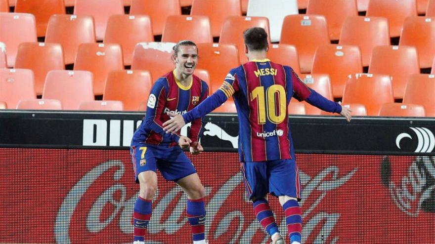 Los azulgrana remontaron con un doblete de Messi y un gol de Griezmann el tanto inicial de Gabriel Paulista y continúan empatados con el Real Madrid en la tabla.