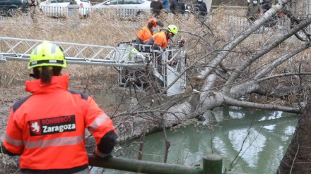 Los Bomberos de Zaragoza retiran un árbol de grandes dimensiones que había caído en el Canal por el temporal