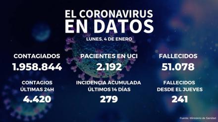 El Ministerio de Sanidad ha notificado 30.579 nuevos positivos de covid-19, lo que eleva la cifra total de contagios a 1.958.844 y la de muertos a 51.078, con 241 más desde el pasado jueves, así como un incremento de 1.923 enfermos ingresados, que han incrementado la ocupación hospitalaria hasta el 11,2 % y la de las ucis al 23 %. ,Según los datos de Sanidad, que ha reportado un descenso de la incidencia acumulada en 14 días, que baja en 7,29 puntos hasta los 272,22 casos d