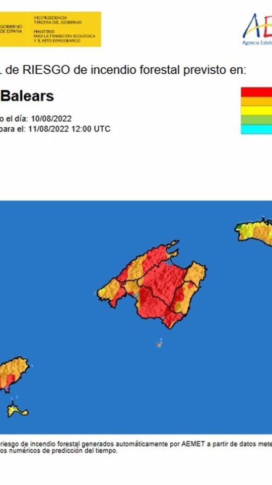 La AEMET ha indicado que el índice de riesgo de incendio para este jueves es extremno en Ibiza y Mallorca, y muy alto en zonas de Menorca