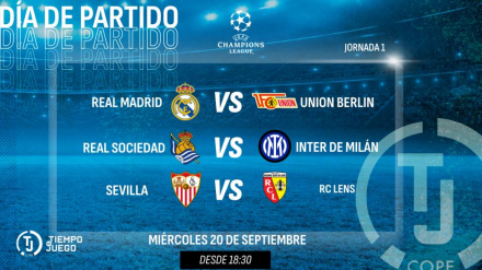 Escucha el Real Madrid - Union Berlin, el Real Sociedad - Inter y el Sevilla - Lens este miércoles a partir de las 18.30 horas en Tiempo de Juego, en su debut en Champions.