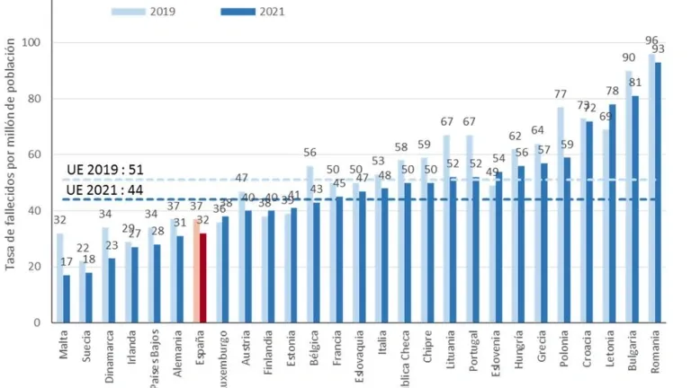 La tasa de mortalidad se situó en 32 personas fallecidas por millón de habitantes, una de las más bajas de la Unión Europea en 2021, y por delante de países con gran tradición en seguridad vial como Finlandia (40) Austria (40), Bélgica (43) o Francia (45). La tasa media de los países de la Unión Europea se situó en 44 fallecidos.