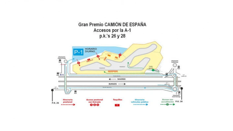 Para acceder a dicho aparcamiento, situado en el circuito, los vehículos procedentes de Madrid circulen por la A–1 podrán utilizar los cambios de sentido existentes en los kilómetros 26 (por vía de servicio) y 28 (San Agustín del Guadalix) de dicha carretera. También se podrá llegar a este estacionamiento utilizando la M–607, desde Madrid a Colmenar Viejo, M–104 a San Agustín del Guadalix y A–1 al circuito.