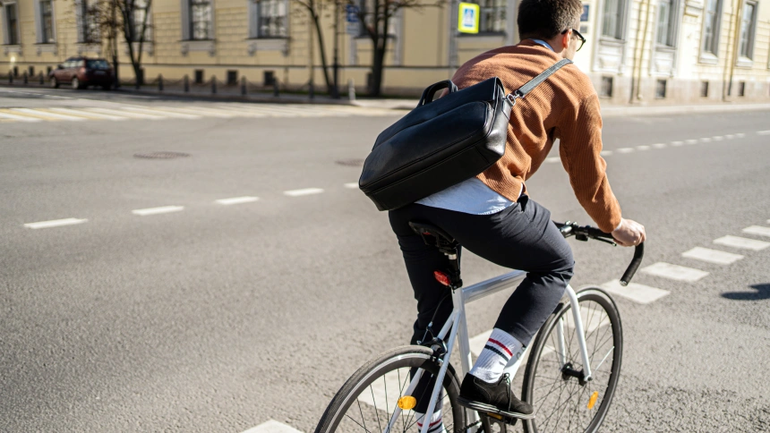 A cyclist with a briefcase rides a bicycle in the city to work.