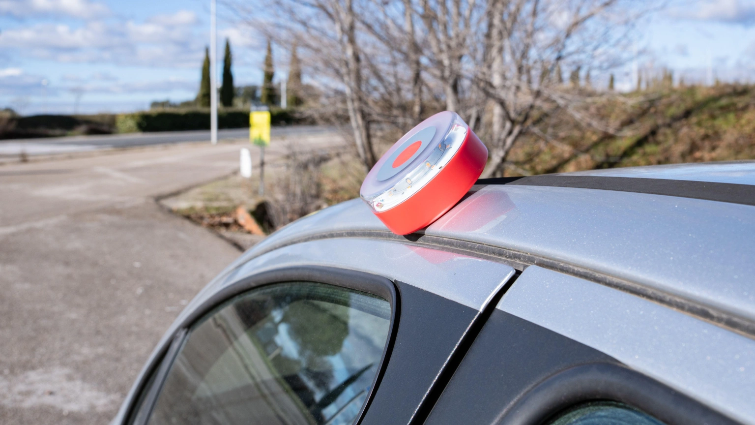 Baliza de emergencia V16 en el techo de un vehículo detenido en la cuneta. Esta señal luminosa forma parte del sistema de seguridad obligatorio implementado en España.