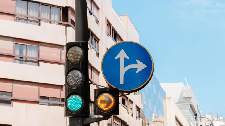 Vista de calle urbana con semáforo verde y señal azul que muestra solo giros hacia adelante y hacia la derecha