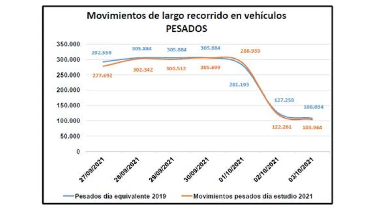 Según los datos registrados por DGT, los movimientos de largo recorrido de los vehículos pesados están en niveles similares a los que se registraban antes de la pandemia, tal y como se refleja en el gráfico.