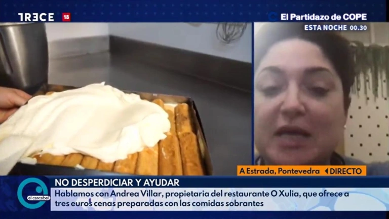 En 'El Cascabel' hemos hablado con Andrea Villar, propietaria del restaurante O Xulia, que ofrece a tres euros cenas preparadas con las comidas sobrantes: "Yo tengo 4 primeros y 4 segundos, y lo que me sobre eso es lo que despacho a la noche. Hoy han sido fideos con pulpo, mañana serán lentejas, pueden ser ternera asada, menestra de verduras, una empanada... Los precios varía entre los 3 euros y los 4 y medio. Esto es todo a través de una lista de difusión de WhatsApp. La gente me hace el pedido, confirmo el pedido y lo vienen a buscar".
