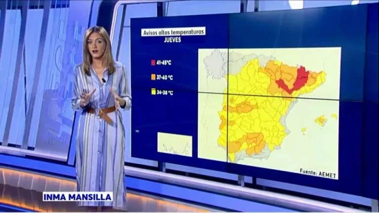 Este jueves, la ola de calor deja temperaturas significativamente altas en buena parte del interior peninsular y en Baleares: máximas de entre 36 y 38 grados en el interior peninsular y de Mallorca y de hasta 40 y 42 grados en los valles de la vertiente atlántica sur y en el valle del Ebro.