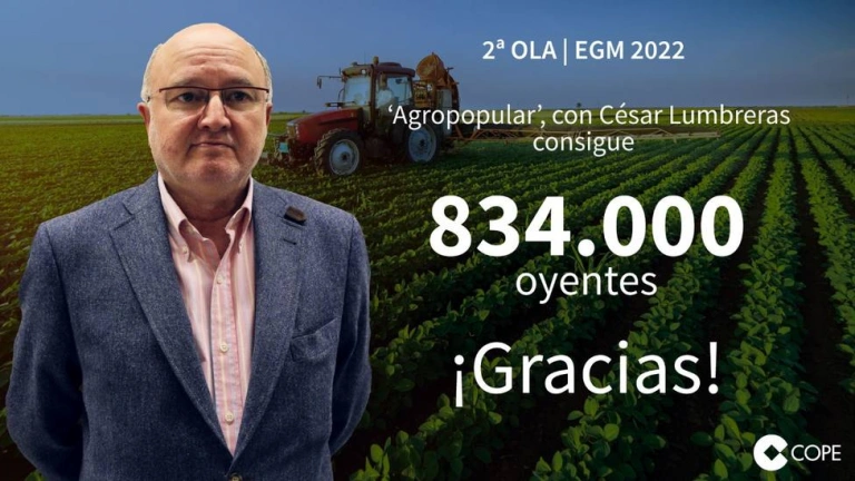 El programa de radio Agropopular ha logrado en la temporada 2021-22 uno de los mejores resultados de su historia, al cosechar una media de 822.000 oyentes en las tres oleadas del Estudio General de Medios (EGM). Los datos de la última de ellas se han conocido el martes 5 de julio y adjudican a Agropopular, que cumplirá el día 28 de julio 38 años en antena, 834.000 oyentes. Este programa se emite todos los sábados en directo, incluso en las épocas vacacionales, entre las 08:30 y las 10 de la mañana a través de la Cadena COPE.