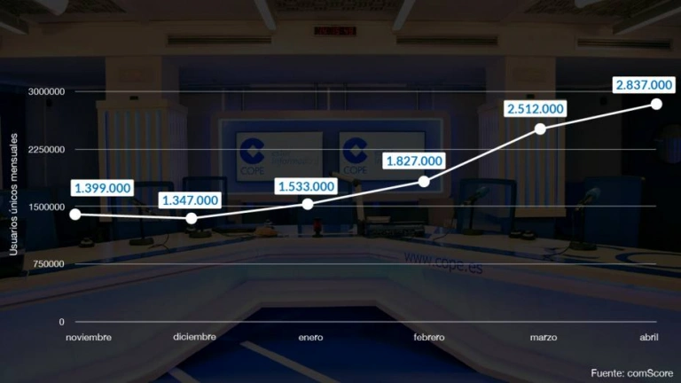 COPE.es no deja de crecer. La web, inmersa en un ambicioso plan de transformación digital, sigue sumando lectores mes a mes. 2.837.000 personas visitaron nuestra página durante el pasado abril según datos publicados por comScore, el medidor de referencia en el mercado. Esta cifra supone el mejor dato histórico para COPE.es, superando en un 12% el registro de marzo y duplicando (102,9%) el obtenido en abril del año pasado. En término interanual, COPE.es es la web de radio que más crece, frente al 28,64% de CadenaSer.com y el 51,92% de Ondacero.es.